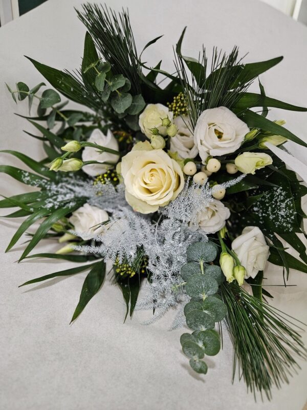 Vaalea joulukimppu syntyy floristin valitsemista kauden kauneimmista kukista.